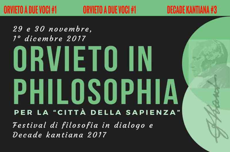 Sotto il titolo “Orvieto in Philosophia: per la città della sapienza”, tra il 29 e 30 novembre e il 1° dicembre si terranno ad Orvieto, presso l’Auditorium della Fondazione Cassa di Risparmio e il Palazzo del Capitano del Popolo / Centro Congressi, due iniziative tra loro coordinate e con gli stessi obiettivi: il 1° Festival di filosofia in dialogo “Orvieto a due voci” e la 3^ edizione della Decade kantiana.