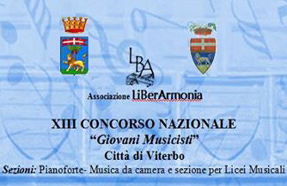 Sezioni: PianoforteMusica da camera (strumentale e vocale con o senza pianoforte – pianoforte a quattro mani)Musica da camera (sezione per scuole medie ad indirizzo musicale e licei musicali) (strumentale e vocale con o senza pianoforte – pianoforte a quattro mani)Presidente di giuria: M° Roberto Plano. Il Concorso, nato nel 1999 grazie alla sinergia tra Lions Club di Viterbo, Leo Club di Viterbo e la Fondazione Eximia Forma, ha visto la partecipazione di oltre 500 candidati provenienti da tutte le parti d’Italia.La Direzione artistica è affidata al M° Liliana Bernardi, assistita dalla prof.ssa Antonella Bernardi la cui esperienza e consolidata nell’arco di un ventennio in campo artistico e organizzativo.Inizialmente concorso esclusivamente pianistico, prevede anche la sezione archi solisti e musica da camera (pianoforte e duo a quattro mani), dall’edizione 2011 partecipano anche i fiati con categoria unica senza limiti di età.