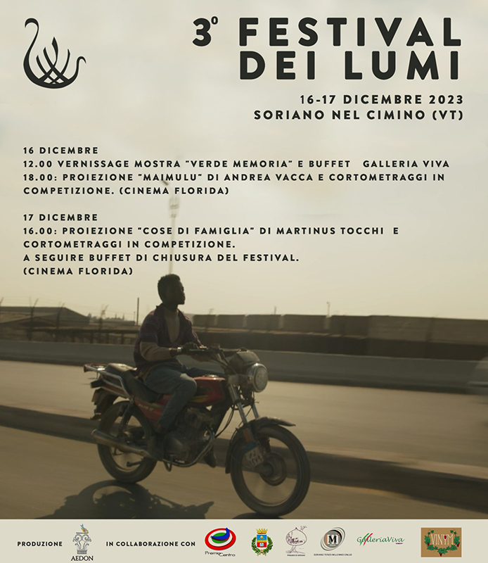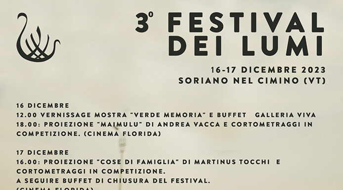 Il Festival dei Lumi, prodotto con passione da Aedon Cultura aps e sostenuto dal Comune di Soriano Nel Cimino, si prepara ad illuminare il comune viterbese per la sua terza edizione, in collaborazione con la Pro Loco Soriano, l’associazione Premio Centro, Galleria Viva, l’associazione Soriano Terzo Millennio, Vinum Soriano e Theatr-es. Il Festival celebra l’autenticità cinematografica, proiettando cortometraggi di vari generi e provenienze. Alla sua terza edizione, si espande in un evento di due giorni, includendo anche arte contemporanea e videoarte. Soriano nel Cimino, con la sua storia, offre il contesto perfetto per un festival che, tra passato e presente, vuole proporsi come un catalizzatore di creatività.