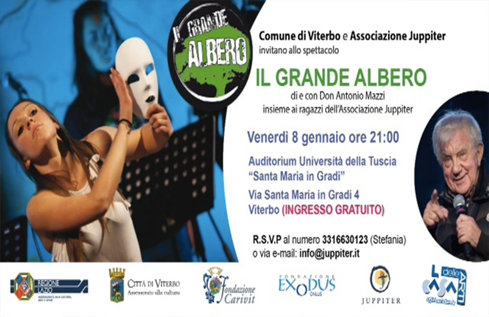Il Comune di Viterbo e l’associazione Juppiter hanno organizzato, presso l’Auditorium Santa Maria in Gradi dell’Università degli Studi della Tuscia, Il Grande Albero, lo spettacolo di e con Don Antonio Mazzi, fondatore di Exodus e i ragazzi di Juppiter.