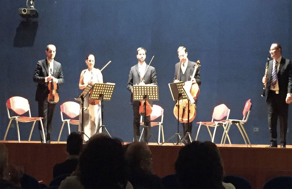 Il Quartetto Le Metamorfosi Musicali e Giammarco Casani al clarinetto hanno diviso in tre parti la loro esibizione: Primo è stato il grande Mozart, di cui l’esecuzione ha saputo cogliere l’anima della melodia mozartiana e questa anima ha raggiunto il cuore degli spettatori. (Quitetto in la maggiore K581 per clarinetto, due violini, viola e violoncello)