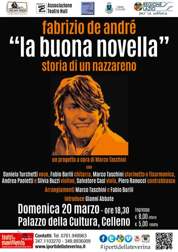 Per la Domenica delle Palme 20 marzo, il Teatro Null Officina culturale della Regione Lazio, propone alle 18,30 al Palazzo della Cultura di Celleno “La Buona Novella” di Fabrizio De André, con Daniela Turchetti voce, Fabio Barili chitarra, Marco Taschini clarinetto e fisarmonica, Andrea Paoletti, Silvia Buzzi violino, Salvatore Casi viola, Piero Ranucci contrabbasso, arrangiamenti Marco Taschini e Fabio Barili, introduce Gianni Abbate.