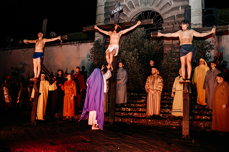 Tra il luccichio di cento fiaccole di tela e cera poste su le due fiancate della chiesa, si snodano i vari figuranti sulla scia della vecchia processione, oggi completamente rivista e corretta, notevolmente ampliata e fedelmente storica, consta di 350 figuranti, dieci cavalli e una biga romana trainata da due cavalli.