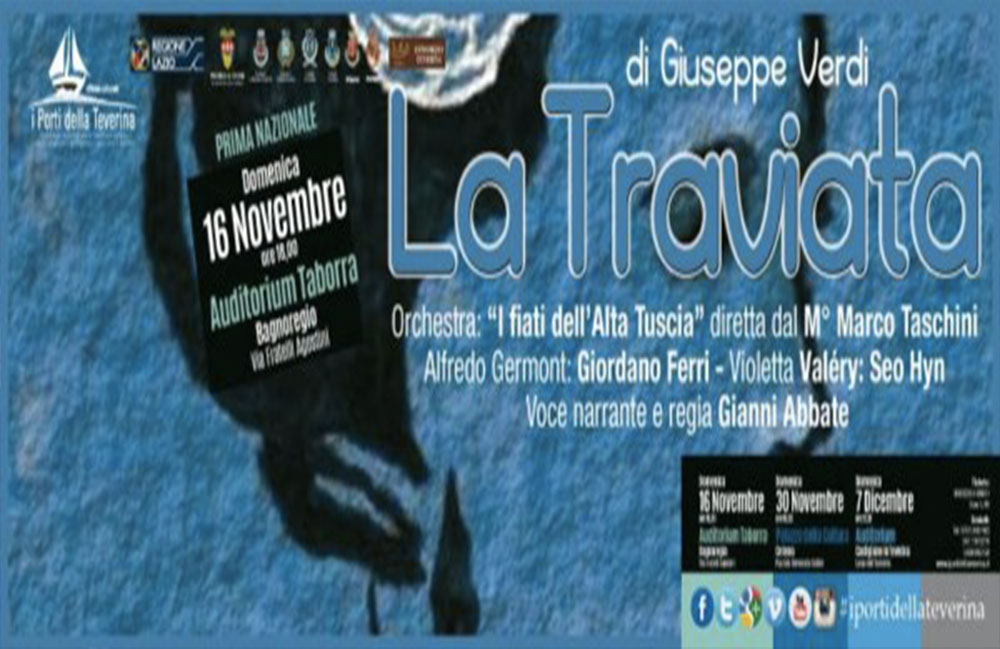 Il Teatro Null, Officina culturale della Regione Lazio iportidellateverina, presenta domenica 16 novembre alle ore 18,00, presso l’Auditorium Taborra di Bagnoregio, in prima nazionale “La Traviata” da Giuseppe Verdi, con l’Orchestra I fiati dell’Alta Tuscia, ben venticinque elementi e alla sua prima apparizione in pubblico, diretta dal M° Marco Taschini, nei panni di Alfredo Germont il tenore Giordano Ferri, mentre Violetta Valéry è interpretata dalla coreana soprano Seo Hyn, voce narrante e regia Gianni Abbate.