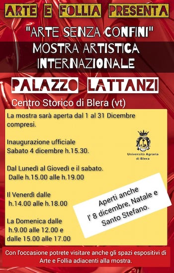 Sabato 4 dicembre, a Blera alle ore 15.30, verrà inaugurata la mostra “Arte senza confini”, mostra artistica internazionale ideata e promossa dalla galleria Arte e Follia. Alla mostra nella bellissima location di Palazzo Lattanzi parteciperanno artisti italiani e oltre i confini nazionali, provenienti da: Belgio, Spagna, Francia, Romania, Albania, Bulgaria e Italia. Ricordiamo, tra gli altri, i viterbesi Massimo De Angelis, Pino Fochesato, Angelo Russo e la belga Frieda Jonckers. Ma sono tanti i nomi di valore che “coloreranno” in modo un po’ inusuale lo storico Palazzo, con quel pizzico di giusta follia che fa dell’evento una Kermesse unica nel genere.