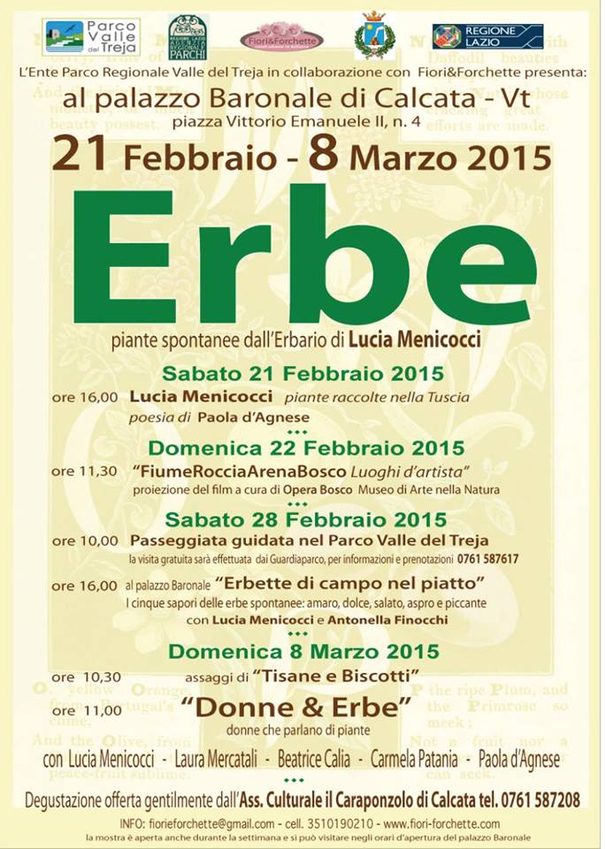 Le piante selvatiche sono da sempre oggetto di numerosi studi sulle loro proprietà terapeutiche e nutrizionali. Per far comprendere l’importanza delle erbe spontanee sia nell’alimentazione che per scopi medicinali l’Ente Parco Regionale Valle del Treja in collaborazione con Fiori&Forchette presenta “Erbe” una rassegna sulle piante spontanee che si terrà dal 21 febbraio all’8 marzo al Palazzo Baronale di Calcata in Piazza Vittorio Emanuele II n. 4.