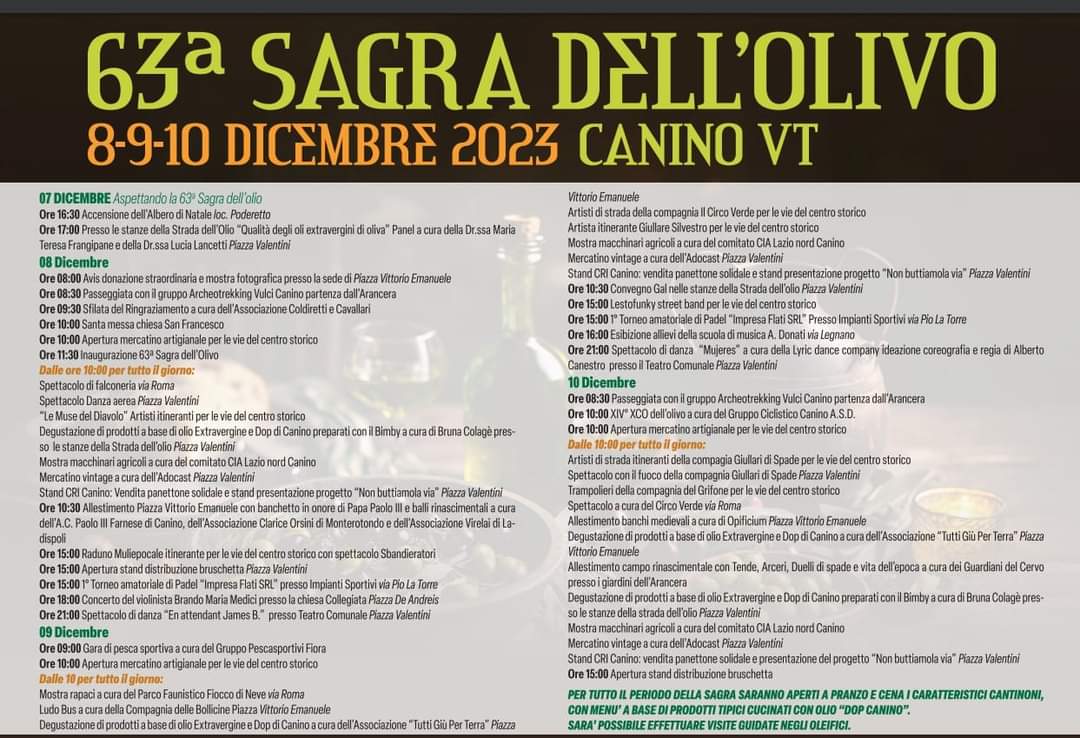 L’ultimo giorno, il 10 dicembre, sarà pieno di appuntamenti. Dalle 8,30 ci sarà la passeggiata con il gruppo Archeotrekking e poi dalle 10 e per tutto il giorno gli artisti di strada itineranti della compagnia Giullari di Spade per le vie del centro storico; lo spettacolo con il fuoco in Piazza Valentini; i trampolieri della compagnia del Grifone; e uno spettacolo a cura del Circo Verde in Via Roma. Non mancheranno gli allestimenti di banchi medievali a cura di Opificium Piazza Vittorio Emanuele e la degustazione di prodotti a base di olio Extravergine e Dop di Canino a cura dell’Associazione “Tutti Giù Per Terra” che si terrà in Piazza Vittorio Emanuele. Nei giorni della Sagra oltre nei cantinoni, sarà possibile gustare l’olio Dop di Canino presso gli stand degli oleifici e presso lo stand del Comune dove ci sarà la distribuzione gratuita della caratteristica bruschetta.