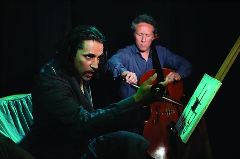 A Celleno quest’anno la location per gli eventi della Notte dell’Arpia sarà il suggestivo fossato del Castello Orsini dove si comincerà venerdì 22 luglio alle 21.00 con la rappresentazione di “Il ritorno di Dali”, monologo eccentrico e surreale scritto, diretto e interpretato da Demian Antonio Aprea, accompagnato al violoncello dal M. Gabriele Fioritti (nella foto). La bravura di Demian saprà trasportare lo spettatore nel mondo surrealista dell’artista spagnolo offrendo uno spaccato della società dell’epoca e della mente di Dalì. L’evento si svolge in collaborazione con Biennale ArteContemporanea di Viterbo.