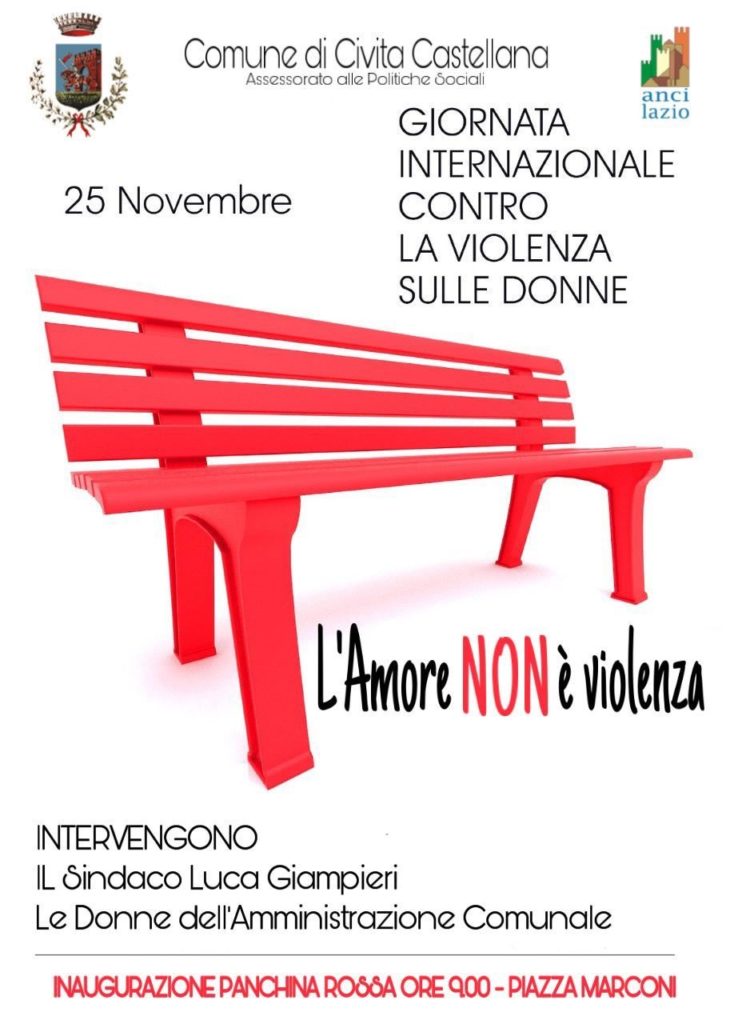 Giovedì 25 novembre alle ore 9.00 a Civita Castellana, in piazza Marconi, in occasione della Giornata internazionale per l’eliminazione della violenza contro le donne, il sindaco Luca Giampieri, l’assessore alle politiche sociali Carlo Angeletti e tutte le donne che fanno parte della giunta e del consiglio comunale parteciperanno alla cerimonia di posizionamento di una panchina rossa, simbolo del contrasto alla violenza di genere.