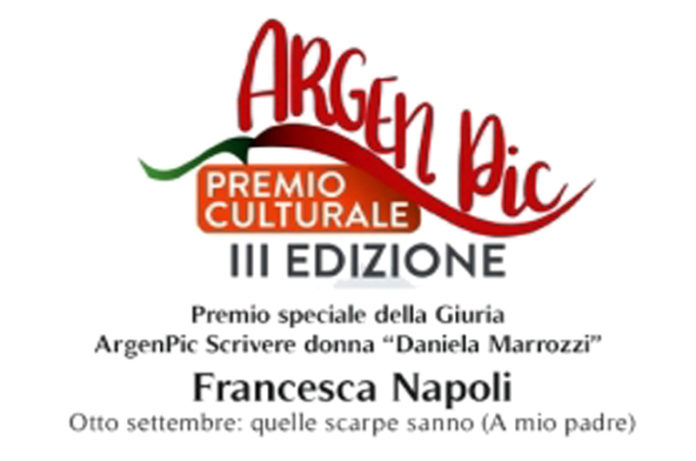 Il prestigioso riconoscimento della Giuria ArgenPic di pertinenza presieduta da Antonio Bartalotta (Ipse Dixit – Delegazione Romana dell’Accademia Italiana del Peperoncino) è stato attribuito per il 2018 all’artista e poetessa di Tarquinia Francesca Napoli per la poesia “Otto settembre: quelle scarpe sanno (A mio padre)”.