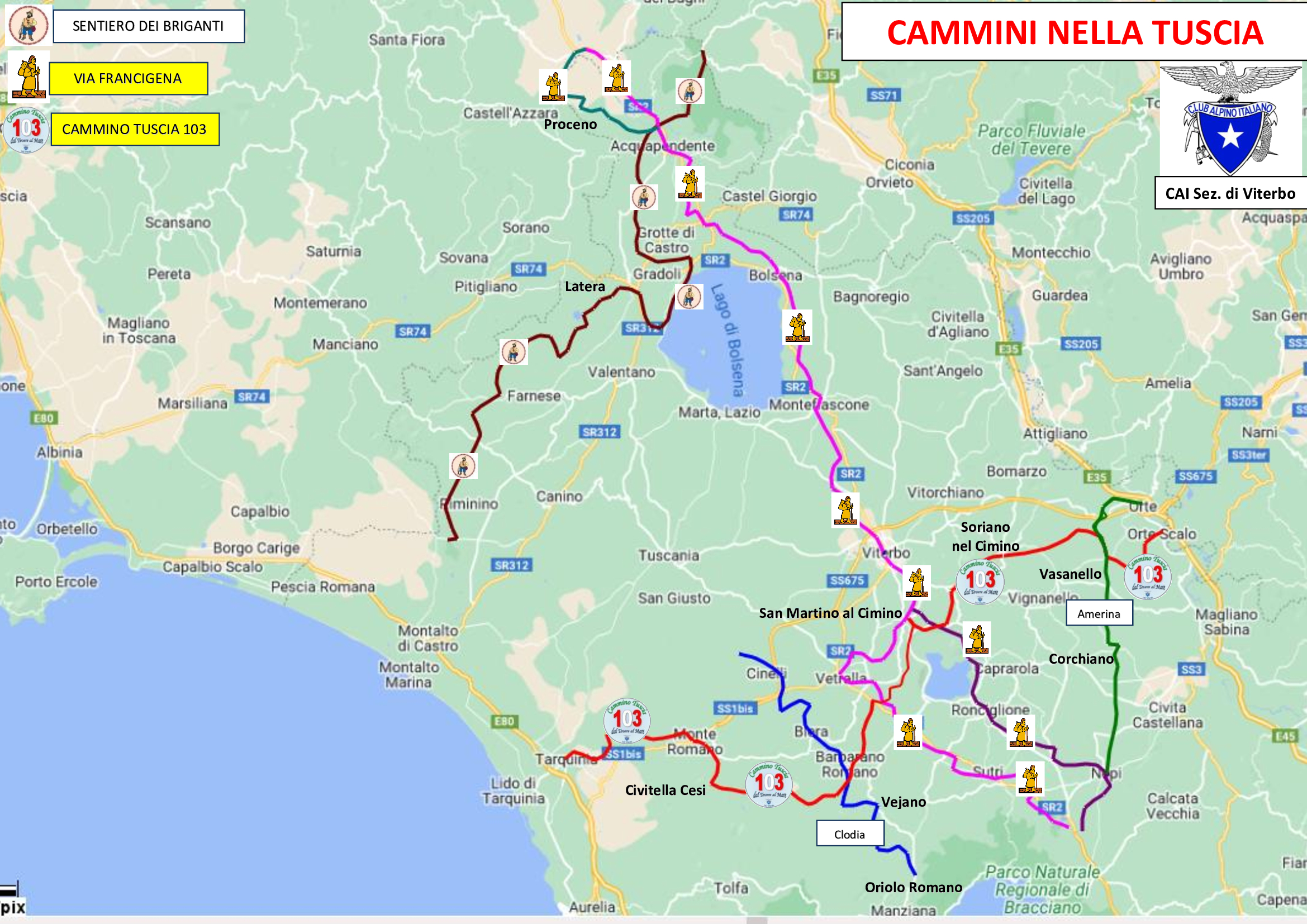 La vasta rete dei sentieri CAI della Tuscia Viterbese, collegata con la rete escursionistica nazionale e inserita nel Catasto regionale e nazionale dei sentieri, è stata realizzata dai volontari della Sezione grazie ad un lavoro di squadra durato più di 10 anni.