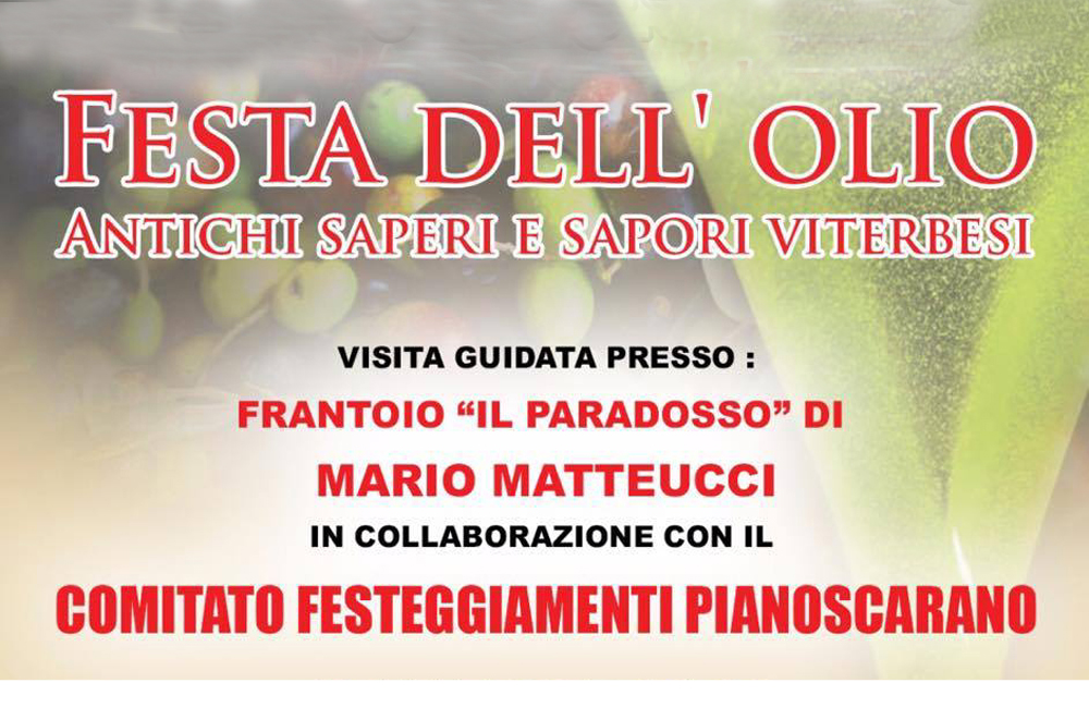 Torna la festa dell’Olio a Viterbo nel popolare quartiere Pianoscarano. Sabato 10 dicembre, il Comitato festeggiamenti Pianoscarano, Carmine e Salamaro, guidato da Paolo Bracaglia, con il patrocinio dell’assessorato allo sviluppo economico e alle attività produttive del Comune, propone una nuova edizione dell’iniziativa Festa dell’Olio, antichi saperi e sapori viterbesi. Da non perdere alle 16,30 la visita guidata all’interno del frantoio Il Paradosso dell’artigiano Mario Matteucci, con la degustazione (gratuita) di bruschette con “l’olio novo” e la partecipazione di Antonello Ricci e Pietro Benedetti della Banda del Racconto, una suggestiva narrazione, Dalle olive all’olio, passando per il fiscolo, che richiamerà alla memoria la figura di Alfio Pannega. L’appuntamento è direttamente davanti al frantoio.
