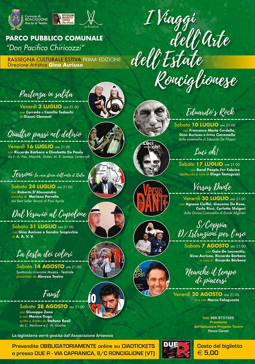 La rassegna culturale andrà avanti fino al 28 agosto ed è promossa dal Comune di Ronciglione in collaborazione con l’associazione culturale “Artenova”. Il cartellone è ricco di spettacoli e personaggi, i generi e i contenuti variano per soddisfare i gusti e le esigenze di un pubblico eterogeneo e per regalare a tutti forti emozioni. In totale, undici spettacoli diversi da non perdere.
