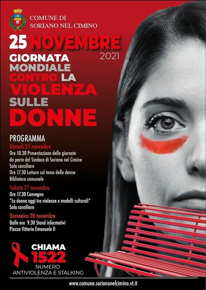 Sensibilizzazione e costante attenzione sul territorio per combattere ogni forma di violenza sulle donne. In occasione della Giornata mondiale contro la violenza sulle donne, ricordata giovedì 25 novembre, l’amministrazione comunale di Soriano nel Cimino ha organizzato una serie di iniziative per sensibilizzare i cittadini su questa tematica così importante, delicata e attuale.