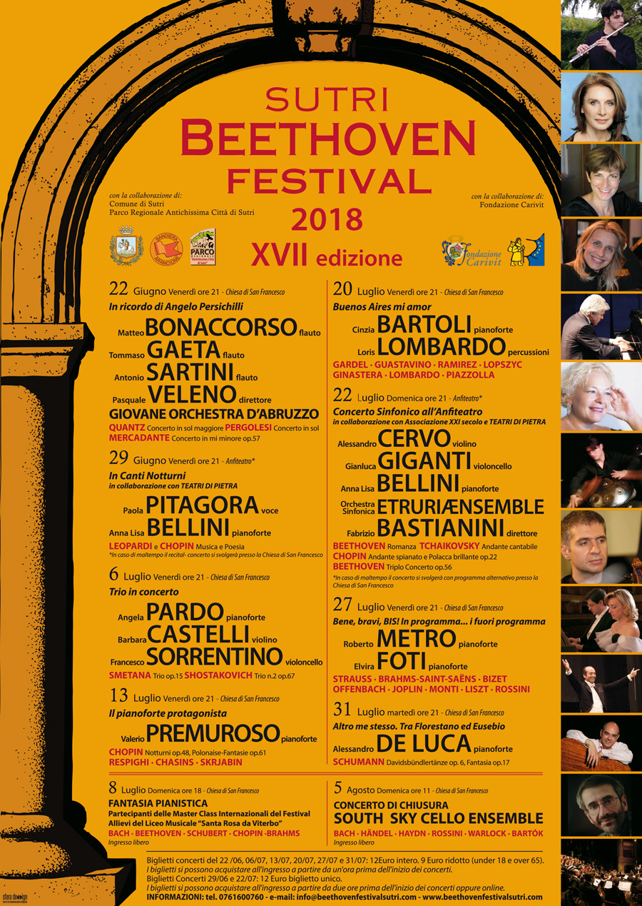 È alle porte il BEETHOVEN FESTIVAL SUTRI 2018 che, lanciato nel 2002 dall’Associazione Amici della Musica di Sutri in uno dei borghi più antichi e misteriosi del Lazio, raggiunge così il prestigioso traguardo della diciassettesima edizione con circa 160 concerti realizzati negli anni. Gli eventi vedranno coinvolti, come sempre, artisti di caratura internazionale nonché giovani talenti emergenti, rinnovando ancora una volta lo stupefacente e miracoloso connubio tra l’arte musicale e gli splendidi monumenti dell’incantevole località della Tuscia.