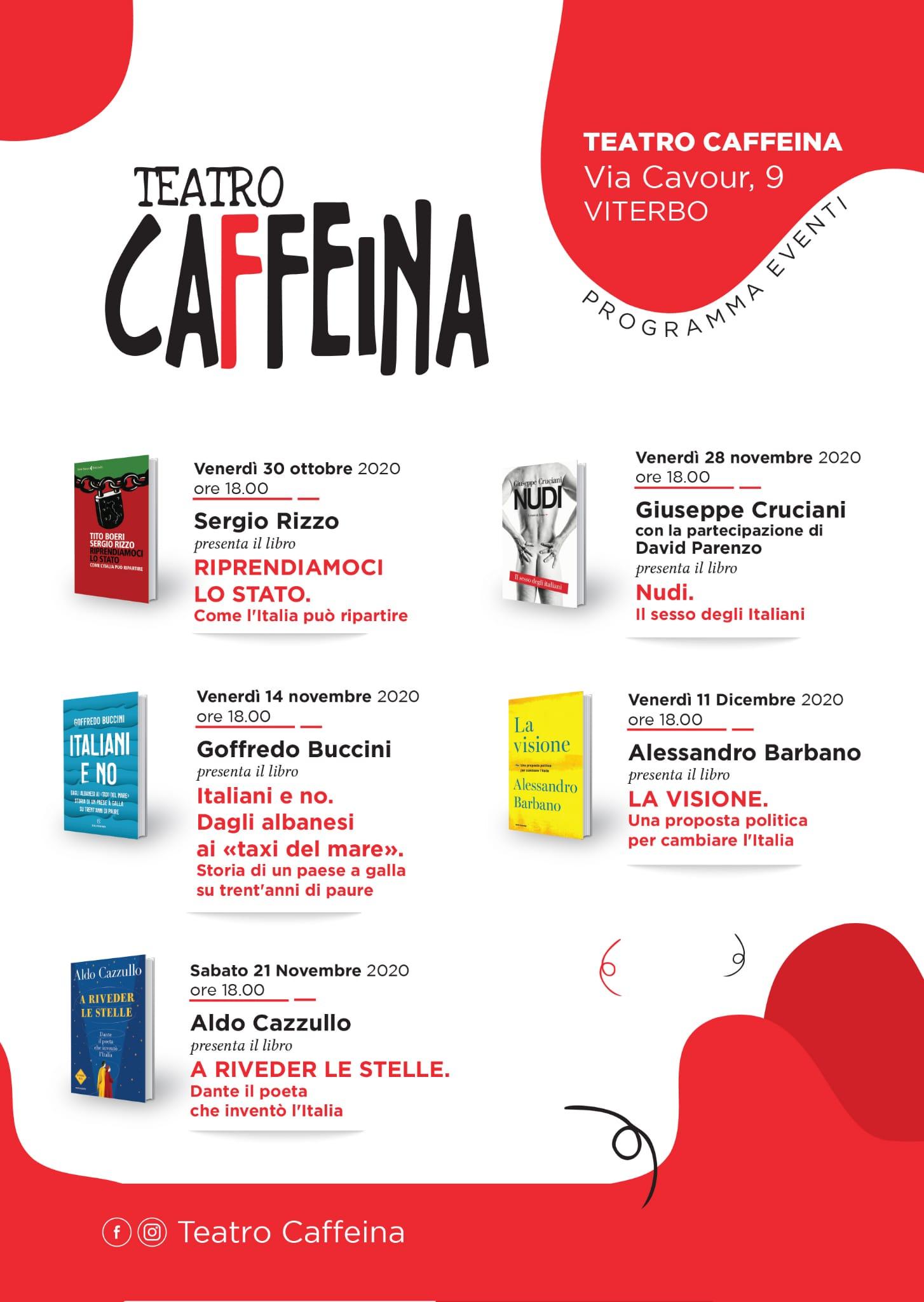 Cinque presentazioni culturali d’eccezione, cinque possibilità per incontrare i principali giornalisti italiani a Viterbo: la programmazione di eventi di Teatro Caffeina riparte dai libri protagonisti del dibattito pubblico italiano, in una formula ovviamente rispettosa al 100% degli obblighi di contenimento sociale. L’ampia sala di via Cavour che tutti gli appassionati conoscono e apprezzano sarà in grado di ospitare gli interessati a non arrendersi e a rifiutare il deserto culturale anche nell’epoca difficile del Coronavirus.