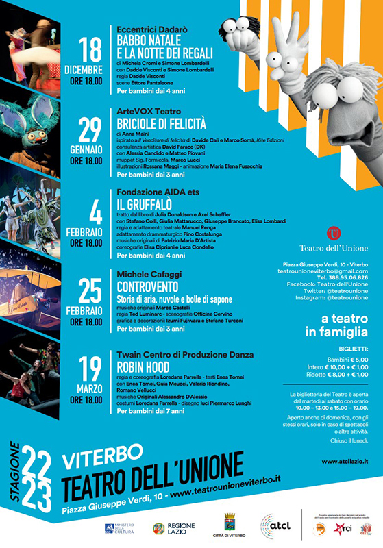 A teatro in famiglia: ha inizio il prossimo 18 dicembre la rassegna pensata per i bambini, nata dalla collaborazione tra il Comune di Viterbo e ATCL Circuito multidisciplinare del Lazio, sostenuto da MIC – Ministero della Cultura e Regione Lazio. Cinque appuntamenti – da dicembre 2022 a marzo 2023 – che offrono la possibilità di entrare in un mondo immaginifico, in cui le favole vengono rielaborate per creare nuovi stimoli e riflessioni più vicini e attinenti alla società contemporanea, sperimentando linguaggi diversi, dalla prosa, alla danza, al teatro di figura, alle videoproiezioni, alle bolle di sapone. Il progetto è stato selezionato da Con i Bambini nell’ambito del Fondo per il contrasto della povertà educativa minorile.