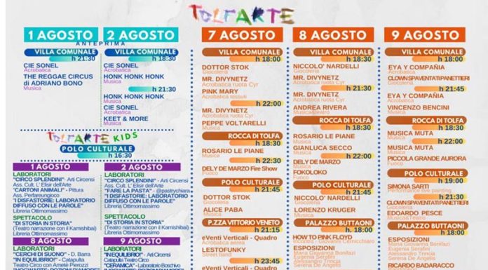 Stavolta sarà una versione obbligatoriamente ridotta per un evento che in passato ha richiamato a Tolfa oltre 50.000 presenze da tutta Italia e artisti da tutto il mondo. Gli spettacoli e le performance si terranno non più per le strade, che non avranno nemmeno installazioni artistiche, ma in definite location, con una cura particolare alle norme per l’emergenza sanitaria.