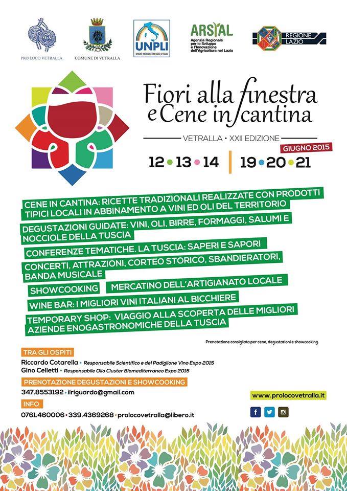 Il borgo di Vetralla, nei weekend del 12, 13 e 14 giugno e 19, 20 e 21 giugno, si tuffa nel passato tra le tradizioni e gli antichi sapori di un tempo con la ventiduesima edizione di “Fiori alla Finestra e Cene in cantina”. La manifestazione è promossa dalla Pro Loco di Vetralla in collaborazione con il comune di Vetralla, l’Unpli, l’Arsial e la Regione Lazio.
