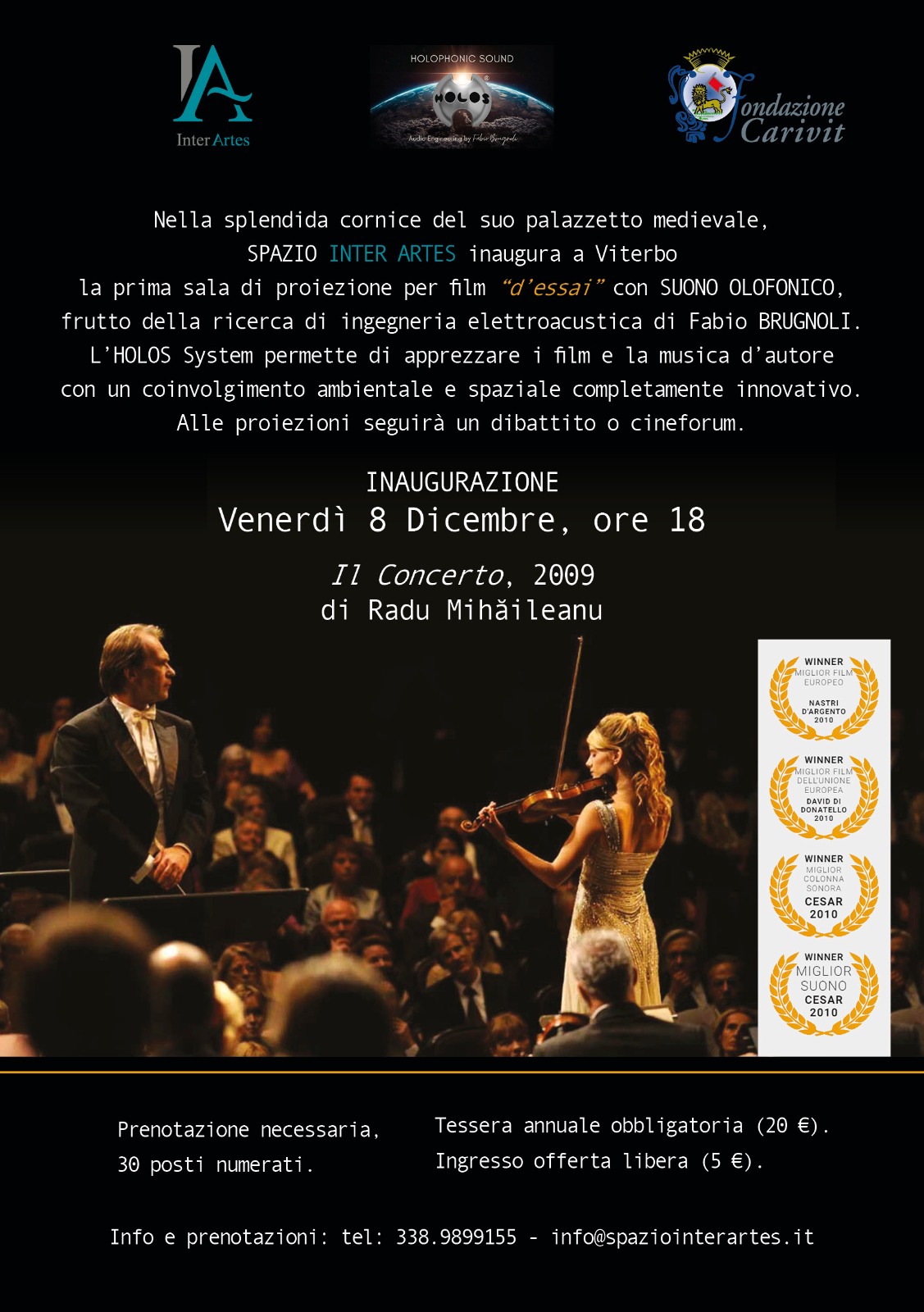 Spazio Inter Artes, il palazzetto della cultura situato nel centro storico a Viterbo, inaugura la prima sala per proiezione di film d’essai con suono olofonico. L’audio è un know-how frutto della ricerca di ingegneria elettroacustica condotta da Fabio Brugnoli. L’olofonia è un oggettivo ampliamento del convenzionale sistema stereofonico e permette di ascoltare l’audio in 3D (omnidirezionale) in aria libera, senza l’impiego del Dolby Digital o altri effetti aggiuntivi. L’HOLOS System permette di apprezzare i film e la musica d’autore con un coinvolgimento ambientale e spaziale mai prima avvenuto.