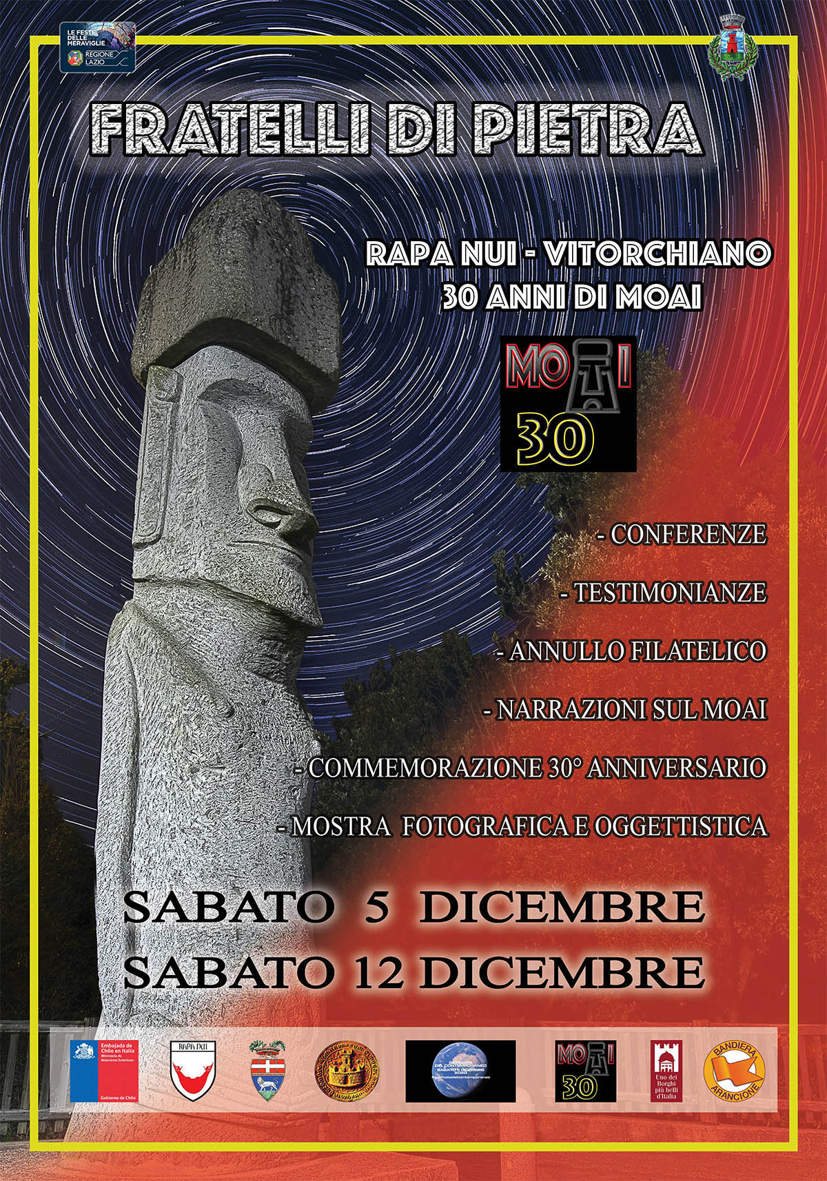 Per celebrare i trent’anni, l’amministrazione comunale, in collaborazione con la Pro Loco, ha preparato una serie di iniziative sotto il titolo “Fratelli di pietra“, per sottolineare il legame culturale e affettivo che unisce Vitorchiano a Rapa Nui e il collante della pietra che lega queste due comunità così distanti tra loro. “Il Moai è una delle principali attrattive del nostro borgo – dichiara il sindaco Ruggero Grassotti – e ha fatto parlare molto di Vitorchiano a livello nazionale e internazionale. Lo abbiamo posizionato in un luogo molto amato sia dagli abitanti locali sia dai visitatori. Sarà dunque emozionante ripercorrere la storia della statua e incontrare le persone, o i loro figli, che hanno reso possibile tutto ciò. Sto seguendo personalmente l’organizzazione di queste iniziative che celebrano un importante momento di apertura e di condivisione, per cui ringrazio tutti coloro che collaborano e sostengono l’evento”.