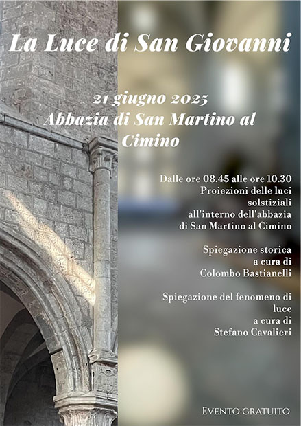 Un momento speciale per vivere insieme qualcosa di raro e bellissimo: “La Luce di San Giovanni”, un fenomeno che, dopo secoli di oblio – dai tempi di Papa Pio III – torna finalmente a mostrarsi. Un gioco tra sole, pietra e spirito, custodito dall’Abbazia e riemerso quasi per magia. Sarà un momento sospeso tra cielo e terra, dove la luce racconta, svela, emoziona.