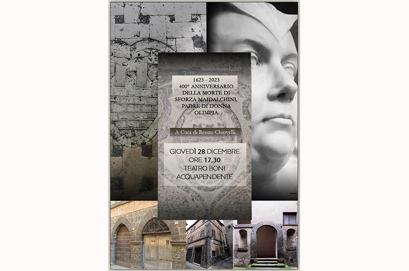 Giovedì 28 dicembre, alle 17.30, presso il Teatro Boni di Acquapendente, inizieranno le celebrazioni per il 4° centenario della morte del capitano Sforza Maidalchini, rimasto celebre per essere stato il padre della famosissima Donna Olimpia. La manifestazione è curata dall’architetto Renzo Chiovelli, col supporto dell’associazione per la cultura “Cassia km 141”. Chiovelli: “I Maidalchini, originariamente Maldacchini, erano una famiglia di mercanti che si era trasferita ad Acquapendente nel 1501 con Bellardino Perugino. Suo figlio Sforza, notaio, diventò Priore e poi Confaloniere della Comunità aquesiana. Imparentatosi con le principali famiglie di Acquapendente, acquistarono una serie di immobili medievali lungo il tratto urbano della Via Francigena, trasformandoli in palazzi rinascimentali – riferisce Renzo Chiovelli -. Proprio nel principale di questi palazzi, nel 1561, dovette nascere Sforza Maidalchini, figlio di Andrea e Pacifica Feliziani. Il palazzo abitato da Sforza fu arricchito da una corte con loggiati in stile tuscanico, decorata con affreschi e graffiti, finché egli non si trasferì a Viterbo, essendo stato nominato appaltatore della Dogana pontificia”. “A Viterbo gli nacque, dalla seconda moglie, Olimpia, che sarebbe diventata la ‘Papessa di Piazza Navona’. Sforza fu capitano e castellano della rocca di Civita Castellana, commissario dei grani a appaltatore delle carni per il Patrimonio in Tuscia. – conclude Chiovelli – Nel 1611 acquisì la cittadinanza viterbese e, morto nel 1623, fu sepolto nella chiesa di Santa Maria in Gradi. Pertanto ricorrono i 400 anni della sua morte e dal 23 dicembre inizieranno una serie di manifestazioni, che continueranno nel 2024 con conferenze sui Maidalchini, visite ai palazzi e luoghi di Donna Olimpia a Roma e San Martino al Cimino, concerti ed altre iniziative”.