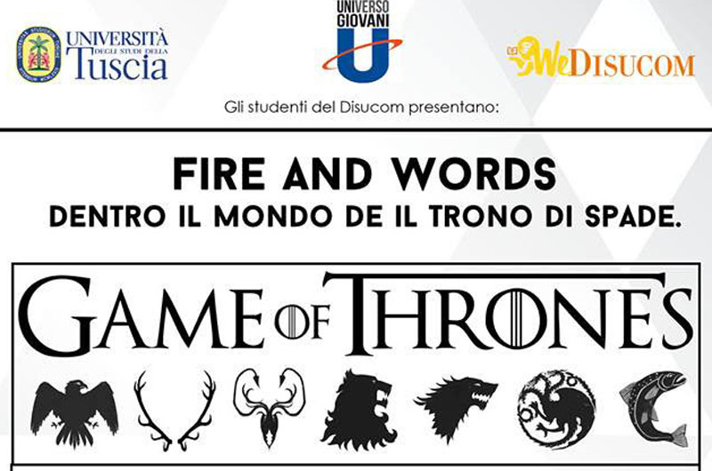 Gli studenti del Dipartimento di Scienze umanistiche, della comunicazione e del turismo dell’Università della Tuscia organizzano e promuovono un seminario aperto a tutti sulla serie televisiva “Game of Thrones” tradotta per il pubblico italiano in “Il trono di spade”. La serie è diventata rapidamente un fenomeno comunicativo complesso e di grande successo, infrangendo molti record di ascolti e amplificando il successo dell’opera di partenza, i romanzi della saga Cronache del ghiaccio e del fuoco scritti dall’americano George R. R. Martin.