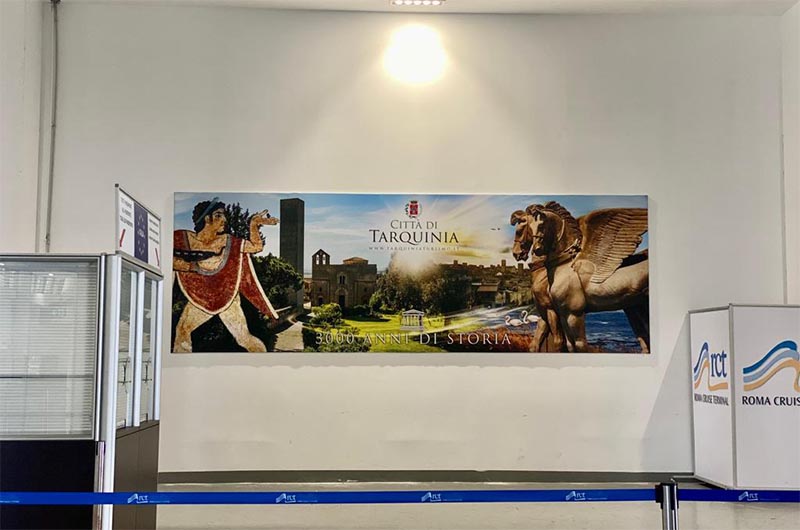 Il pannello fotografico è stato posizionato in un punto di transito strategico, dove tutti i passeggeri che sbarcano e si imbarcano sulle navi da crociera hanno l’opportunità di vedere le bellezze della città di Tarquinia.