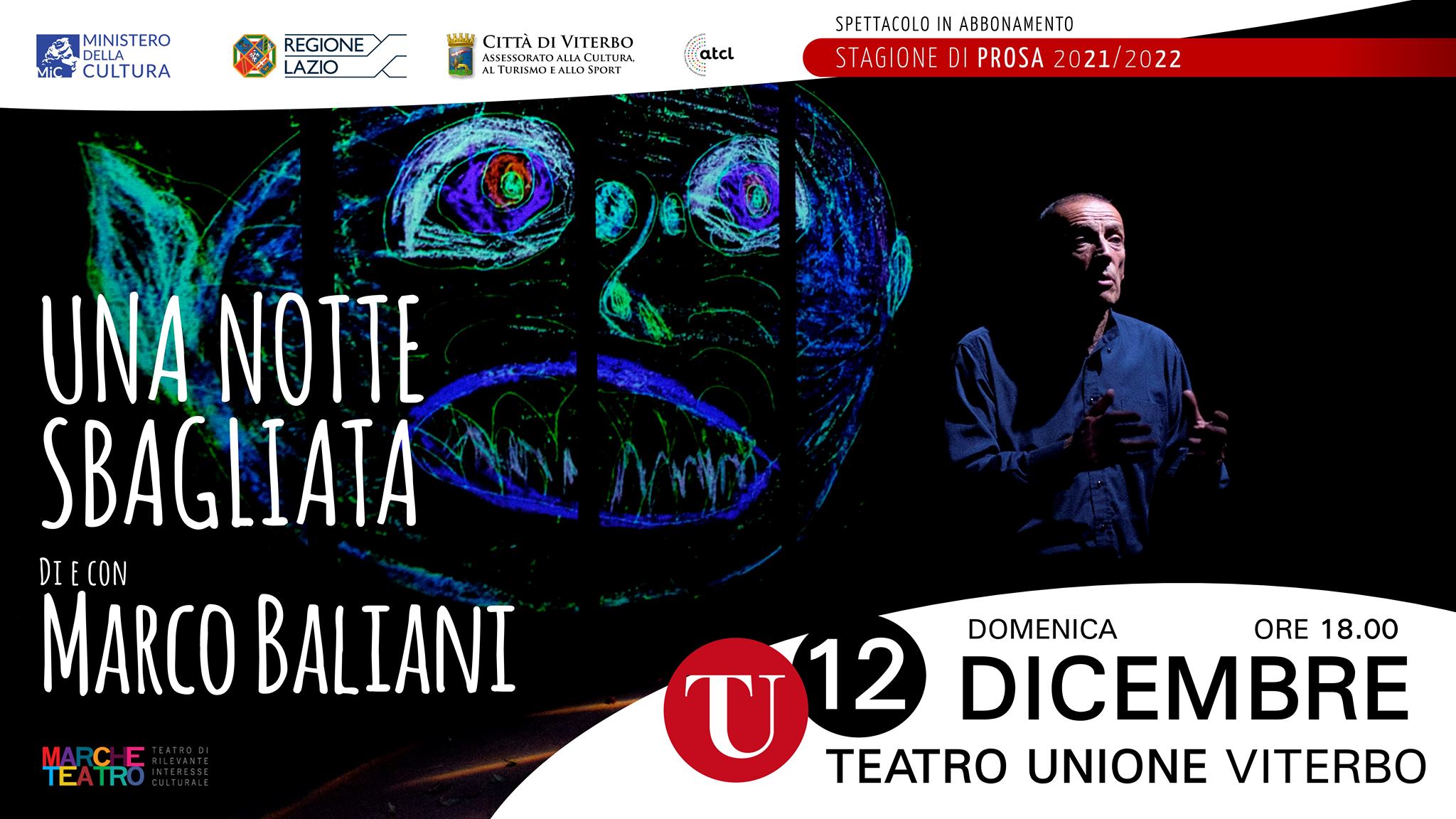 La campagna abbonamento 2021-22, nata dalla collaborazione tra il Comune di Viterbo e ATCL Circuito multidisciplinare del Lazio, sostenuto da MIC – Ministero della Cultura e Regione Lazio, sarà inaugurata con il primo spettacolo il 12 dicembre ore 18.00 al Teatro dell’Unione con uno dei narratori più famosi del teatro italiano, Marco Baliani in Una notte sbagliata di cui è autore, con la regia di Maria Maglietta.