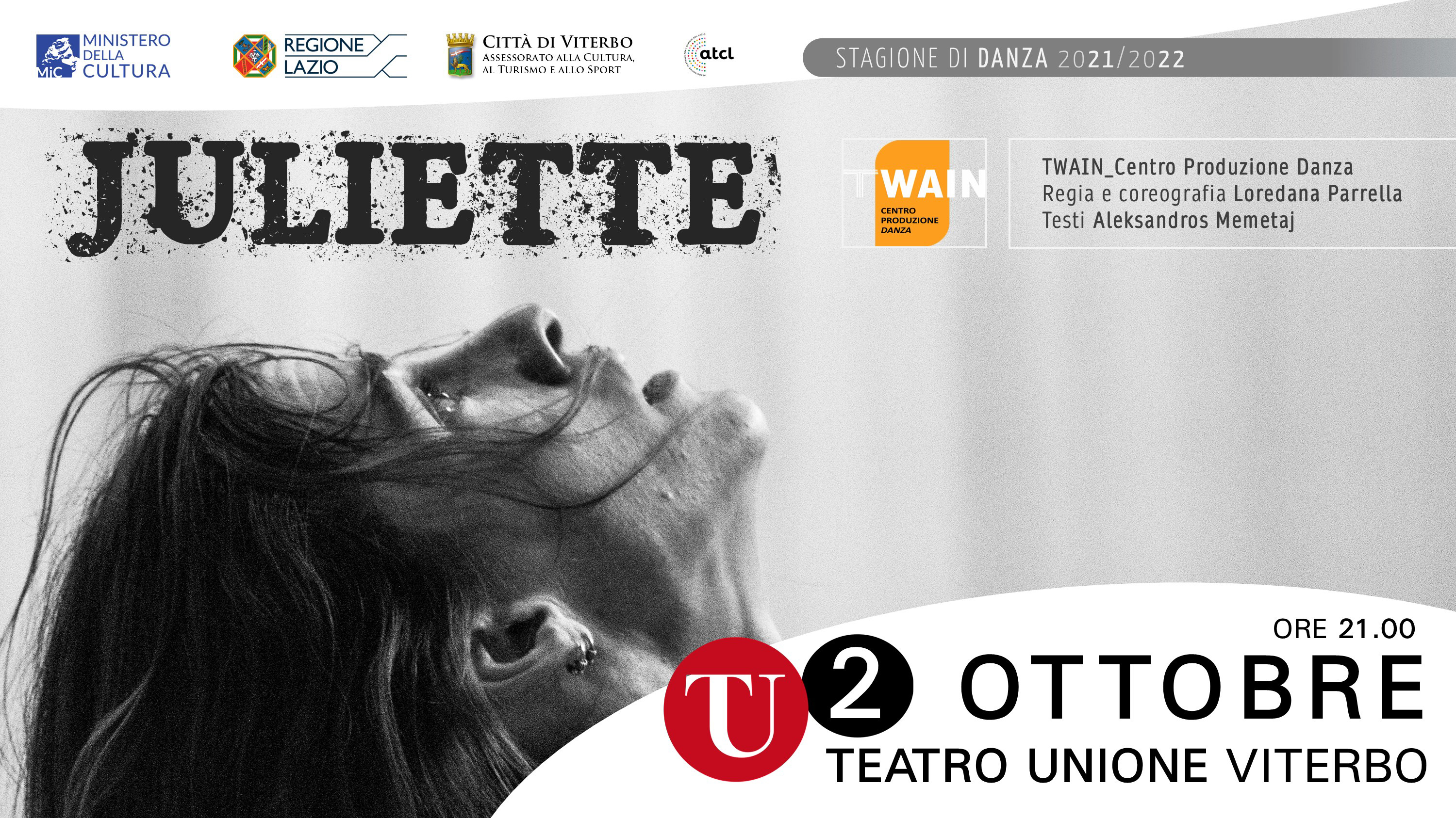 Riapre al pubblico il Teatro dell’Unione con lo spettacolo di danza contemporanea – sospeso per la pandemia – Juliette di Twain Centro Produzione Danza il 2 ottobre ore 21.00, grazie alla collaborazione tra il Comune di Viterbo e ATCL – Circuito multidisciplinare del Lazio sostenuto da Regione Lazio e Mic – Ministero della Cultura.