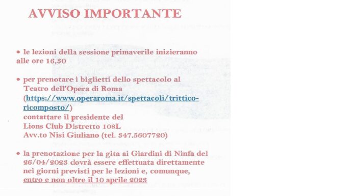 Sono inoltre previste due gite di carattere ricreativo-culturale: una domenica 16 aprile 2023 uno spettacolo al Teatro dell’Opera di Roma e l’altra mercoledì 26 aprile 2023 ai Giardini di Ninfa – Norma e Sermoneta.