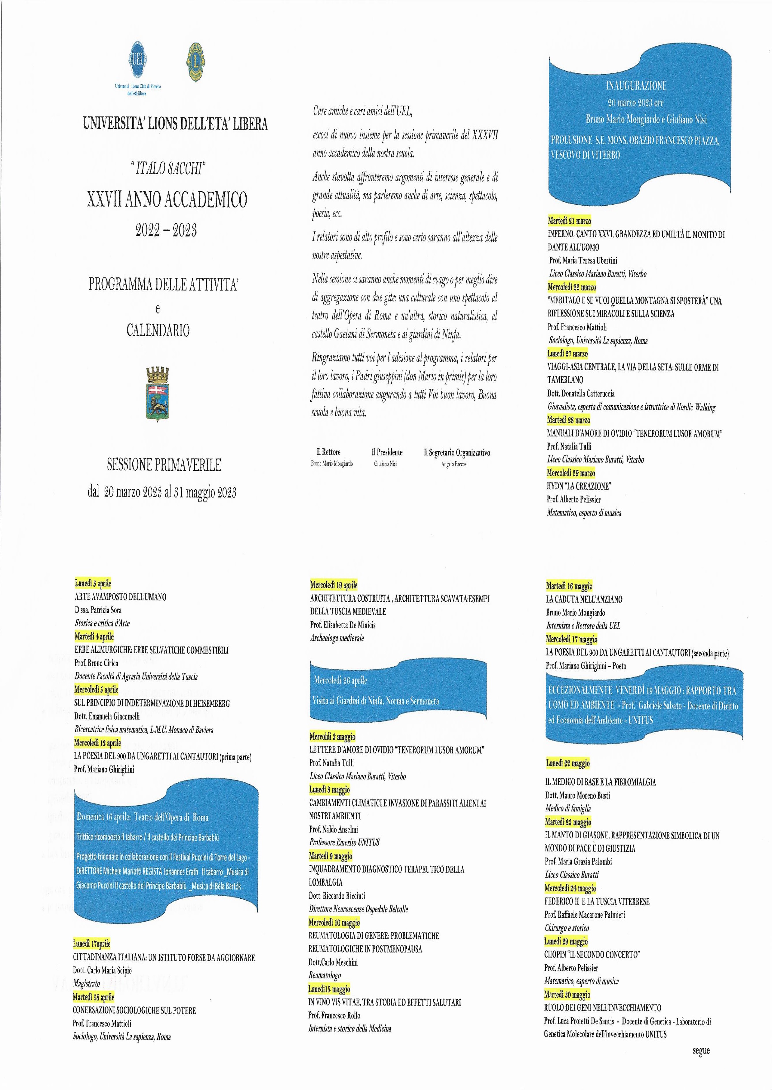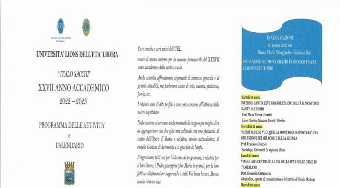 Nella sostanza un ricco programma quello varato della sessione primaverile dell”Università Lions della Terza Età Libera di Viterbo, intitolata a Italo Sacchi. L’unico requisito previsto per l’iscrizione è la voglia di imparare, di mettersi in gioco e di frequentare altre persone che abbiano la curiosità di conoscere e incontrarsi, confrontandosi  in un programma ricco di attività.