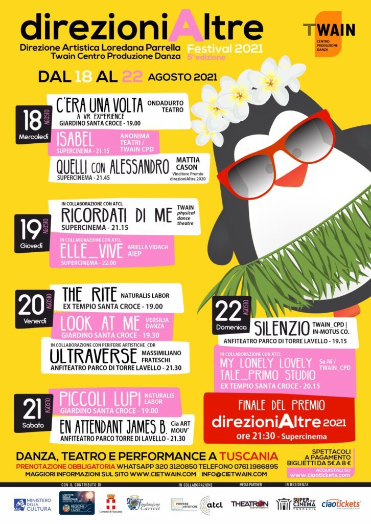 direzioniAltre Festival 2021, organizzato da Twain Centro Produzione Danza, è sostenuto da MiC – Ministero della CulturaRegione Lazio con il Fondo Unico 2021 sullo Spettacolo dal Vivo, Fondazione Carivit Comune di Tuscania. In collaborazione con ATCL Lazio e PERIFERIE ARTISTICHE. Comunicazione Theatron 2.0.