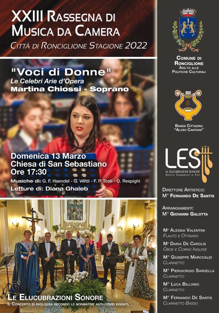 Giunta alla XXIII edizione Il Concerto “Voci di Donne – Le Celebri Arie d’Opera” in occasione della Giornata Internazionale della Donna, sarà eseguito dal sestetto cameristico “Les – Le elucubrazioni sonore” che insieme alla splendida voce del soprano Martina Chiossi ci accompagneranno fra celebri arie d’opera in cui le donne sono sempre protagoniste.