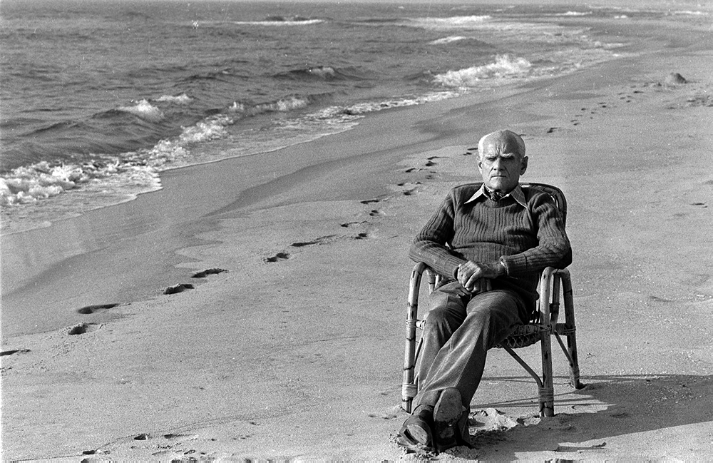 Alberto Moravia sulla spiaggia davanti alla sua casa a Sabaudia, 21/10/1977