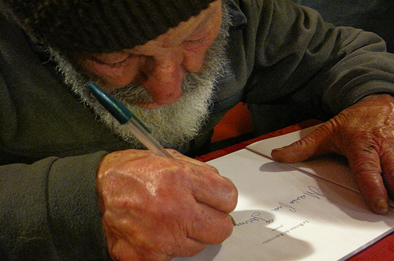 Breve notizia su Alfio Pannega. Nacque a Viterbo il 21 settembre 1925, figlio della Caterina (ma il vero nome era Giovanna), epica figura di popolana di cui ancor oggi in città si narrano i motti e le vicende trasfigurate ormai in leggende omeriche. Dopo gli anni di studi in collegio, con la madre visse fino alla sua scomparsa (nel 1974), per molti anni abitando in una grotta nella Valle di Faul. A scuola da bambino aveva incontrato Dante e l’Ariosto, ma fu lavorando “in mezzo ai butteri della Tolfa” che si appassionò vieppiù di poesia e fiorì come poeta a braccio, arguto e solenne declamatore di impeccabili e sorprendenti endecasillabi. Una vita travagliata fu la sua, di duro lavoro fin dalla primissima giovinezza. Tra innumerevoli altri umili e indispensabili lavori manuali in campagna e in città, per decine di anni ha anche raccolto gli imballi e gli scarti delle attività artigiane e commerciali, recuperando il recuperabile e riciclandolo: consapevole maestro di ecologia pratica, quando la parola ecologia ancora non si usava. Nel 1993 la nascita del centro sociale occupato autogestito nell’ex gazometro abbandonato: ne diventa immediatamente protagonista, e lo sarà fino alla fine della vita. Sapeva di essere un monumento vivente della Viterbo popolare, della Viterbo migliore, e il popolo di Viterbo lo amava visceralmente. È deceduto il 30 aprile 2010, non risvegliandosi dal sonno dei giusti.