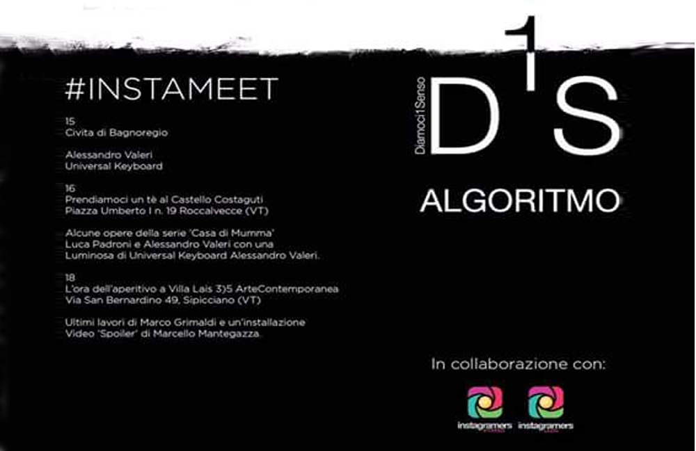 Il programma è intenso e ricco di sorprese: si inizia l’8 dicembre, quando all’ingresso di Civita di Bagnoregio,prenderà vita un’installazione site specific di Alessandro Valeri –intitolata ‘Universal Keyboard’. Lo steso giorno, alle 16, sarà inaugurato un percorso ideale che per 4 giorni unirà Bagnoregio ad altri luoghi legati ad Algoritmo: il Castello Costaguti di Roccalvecce, dove ci saranno alcune opere della serie ‘Casa di Mumma’ di Luca Padroni e un’istallazione luminosa di Alessandro Valeri; poi ancora Villa Lais di Sipicciano, dove in collaborazione con 3)5 ArteContemporanea, si potrà vedere l’ultima produzione di Marco Grimaldi ‘Satelliti in attesa’, e una proiezione di Marcello Mantegazza.