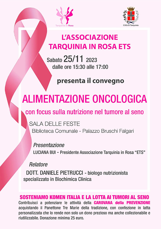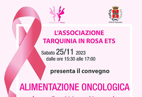 Il delicato argomento verrà approfondito in un convegno scientifico, aperto non solo ai medici ed agli addetti ai lavori ma a tutta la cittadinanza, dal titolo “ALIMENTAZIONE ONCOLOGICA” che si terrà sabato 25 novembre, dalle ore 15:30 nella Sala delle Feste della Biblioteca Comunale di Palazzo Bruschi Falgari, a Tarquinia.(ingresso libero)