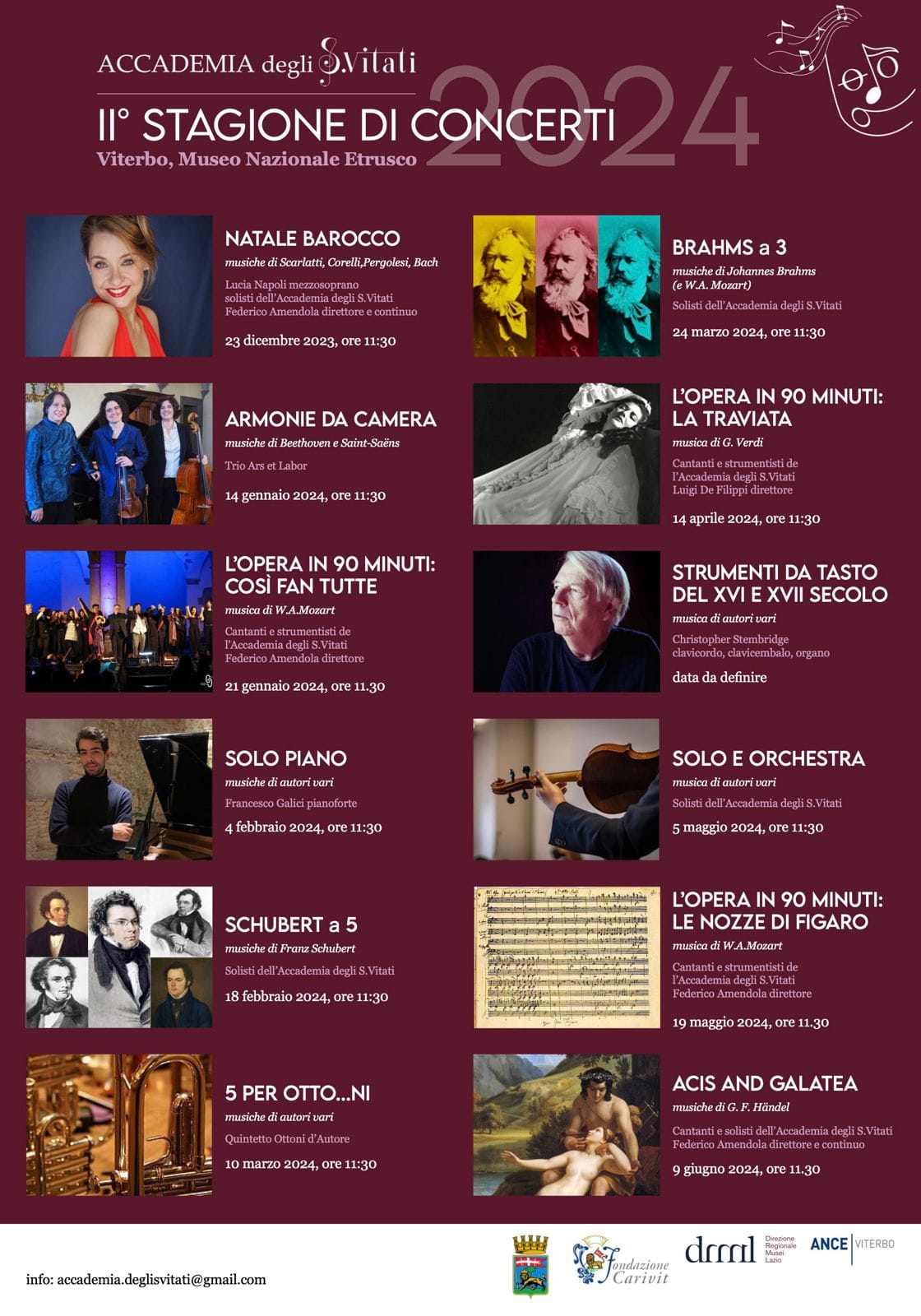Stilato il programma della seconda stagione musicale ospitata al Museo Nazionale Etrusco di Rocca Albornoz e organizzata dall’Accademia degli S.Vitati, che inizierà sabato 23 dicembre con il concerto dedicato al Natale con il mezzosoprano Lucia Napoli, alle ore 11.30.