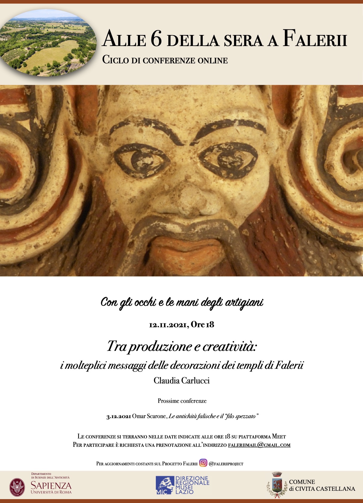 Proseguono gli appuntamenti per il ciclo di videoconferenze “Alle 6 di sera a Falerii”, organizzate dal comune di Civita Castellana in collaborazione con il dipartimento di Scienze dell’Antichità della Sapienza Università di Roma e il Museo archeologico dell’Agro Falisco (Direzione Regionale Musei Lazio). Le iniziative proseguiranno fino a fine 2021 per un venerdi al mese, sempre alle ore 18. Appuntamenti di successo – che hanno registrato una buonissima affluenza in termini di audience e appeal – realizzati in aule virtuali dove possibile “incontrarsi” semplicemente collegandosi online e seguire comodamente, da ovunque ci si trovi, gli incontri narrativi e illustrativi. Il prossimo appuntamento è previsto per venerdi 12 novembre 2021, alle ore 18. Una nuova proposta che aprirà, ancora una volta, un’ulteriore finestra culturale su un mondo accattivante e attraente per la curiosità di un vasto pubblico, grazie alla collaborazione tra la cattedra di Etruscologia e Antichità Italiche del Dipartimento di Scienze dell’Antichità, Sapienza Università di Roma, il Comune di Civita Castellana e il Museo Archeologico dell’Agro Falisco (Direzione Regionale Musei Lazio). Protagonista di questo appuntamento sarà Claudia Carlucci, etruscologa e direttore del Polo museale Sapienza. Al centro delle sue ricerche da sempre c’è lo studio delle terrecotte architettoniche etrusco-italiche, di cui i Falisci hanno lasciato preziose e consistenti testimonianze soprattutto a Civita Castellana. All’ampia e approfondita conoscenza scientifica su un argomento altamente specialistico, da lei trattato in numerose pubblicazioni in ambito nazionale e internazionale, la dottoressa Carlucci affianca una particolare sensibilità per la divulgazione e la promozione del patrimonio archeologico, come dimostra la sua partecipazione in qualità di consulente scientifico a mostre e allestimenti museali. Attualmente è curatore dei musei dell’area archeologia e arte classica e contemporanea del dipartimento di scienze dell’antichità del Polo Museale di Sapienza Università di Roma. Il titolo della sua conferenza, “Tra produzione e creatività: i molteplici messaggi delle decorazioni dei templi di Falerii”, lascia chiaramente intuire l’interessante scenario nel quale si proiettano le terrecotte architettoniche falische, in un percorso che, partendo da gli occhi e dalle mani degli artigiani, ci porta a comprendere quali messaggi si celino dietro immagini che a noi appaiono talvolta puramente decorative. La conferenza si terrà a distanza, in data e orario suindicati, su piattaforma Meet.