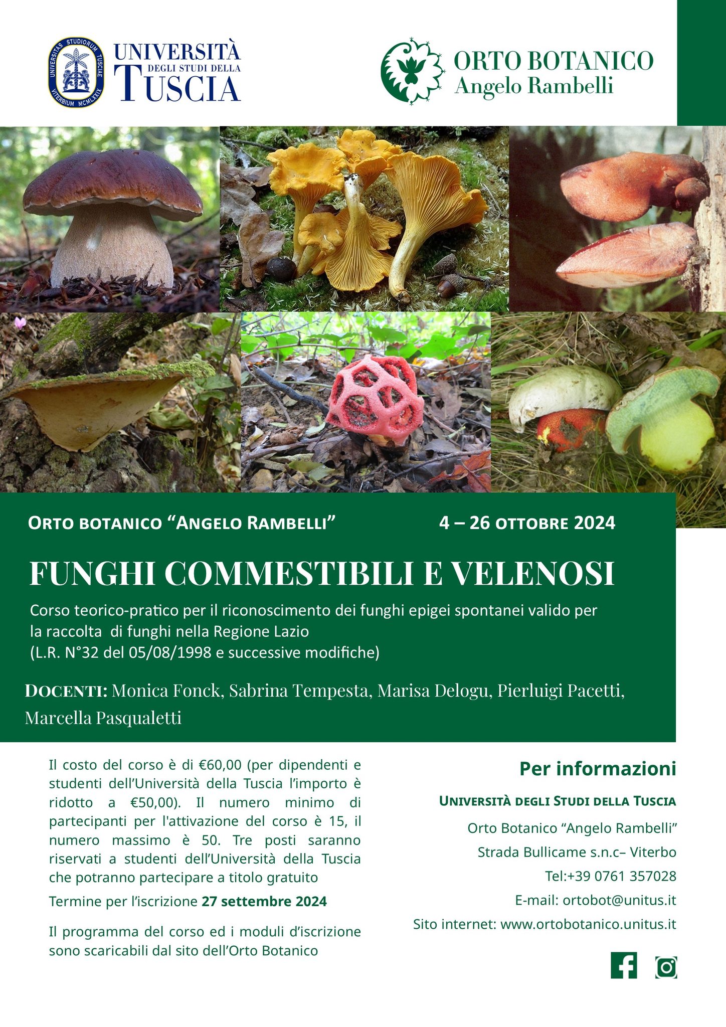 L’Orto Botanico “Angelo Rambelli” dal 4 al 26 ottobre organizza un Corso teorico-pratico per il riconoscimento dei funghi epigei spontanei valido per il rilascio dell’attestato che autorizza alla raccolta (Legge Regionale n. 32 del 5 agosto 1998 e successive modifiche).