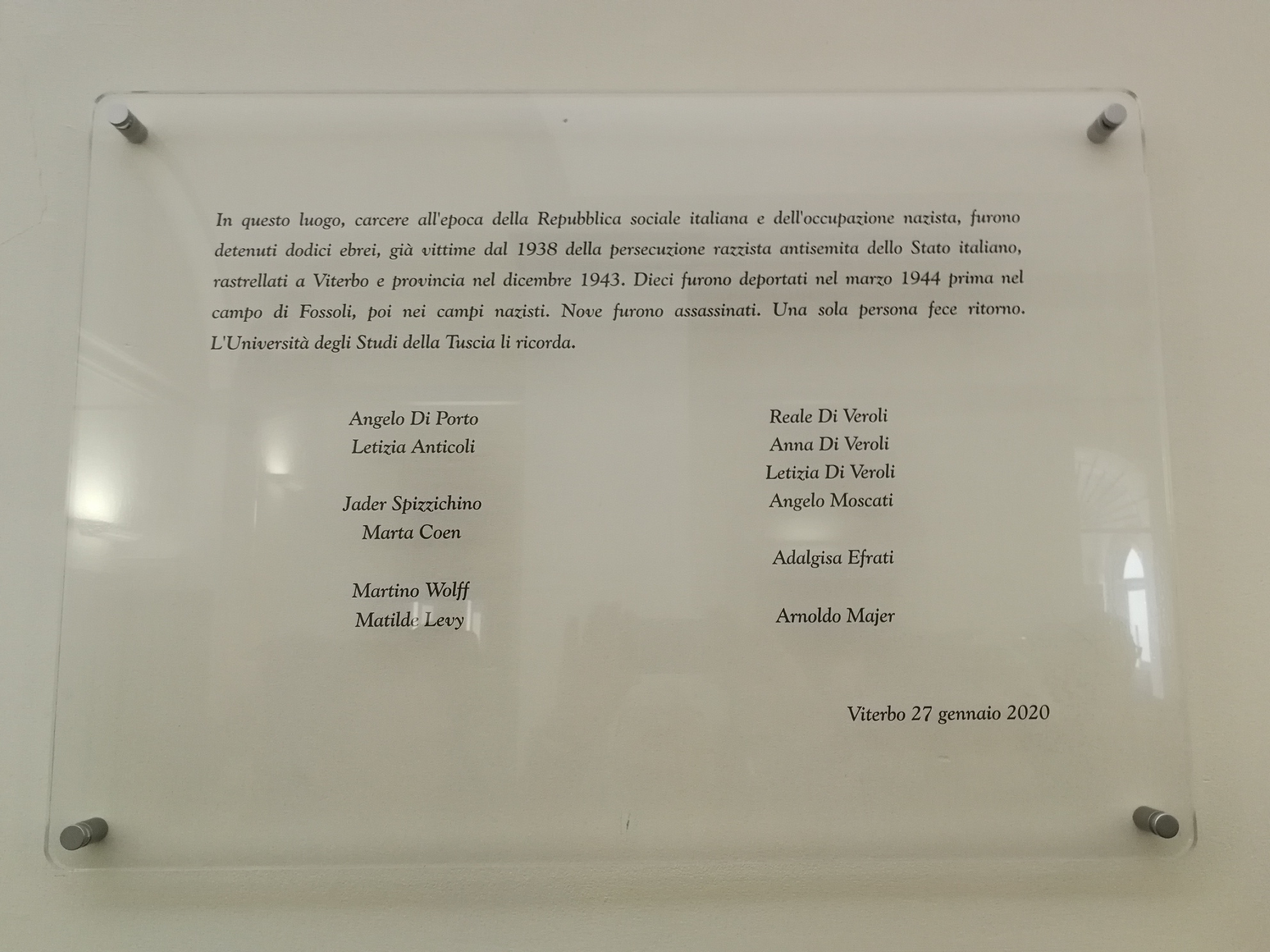 Breve ma significativa cerimonia al rettorato di S.Maria in Gradi dell’Università della Tuscia per ricordare dodici ebrei che furono rastrellati a Viterbo e provincia nel dicembre 1943 e detenuti nel carcere di S. Maria in Gradi. Dieci furono deportati nel campo di Fossoli e poi nei campi nazisti, da dove solamente una sopravvissuta fece ritorno. E’ stata scoperta una targa in ricordo di quelle persone. Prima hanno preso la parola il rettore Stefano Ubertini, l’assessore comunale Antonella Sberna, Angelo Di Porto che ebbe alcuni familiari deportati, il sindaco di Vetralla Franco Coppari e il direttore del dipartimento beni e attività culturali della Comunità ebraica di Roma Claudio Procaccia. Tutti hanno sottolineato l’importanza della memoria di quei tragici anni affinché nessuno possa dimenticarli. Tutte le istituzioni-è stato detto- hanno il dovere di mantenere viva la coscienza di ognuno per allontanare dalla società ogni pericoloso estremismo. Alla cerimonia hanno assistito docenti e personale dell’UNITUS. Nella targa sono riportati di nomi dei deportati: Angelo Di Porto, Letizia Anticoli, Jader Spizzichino, Marta Coen, Martino Wolff, Matilde Levi, Reale Di Veroli, Anna Di Veroli, Letizia Di Veroli, Adalgisa Efrati, Arnoldo Majer.