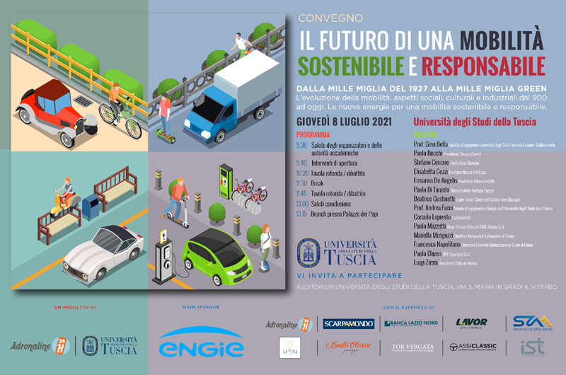 Giovedì 8 luglio, presso l’Auditorium Università degli Studi della Tuscia a Viterbo (via S. Maria in Gradi 4, Viterbo, dalle 9.30 alle 13.00, si terrà il convegno “Il futuro di una mobilità sostenibile e responsabile”, ideato e organizzato da Adrenaline24h e Università della Tuscia, realizzato grazie al supporto di Engie Italia S.p.A.