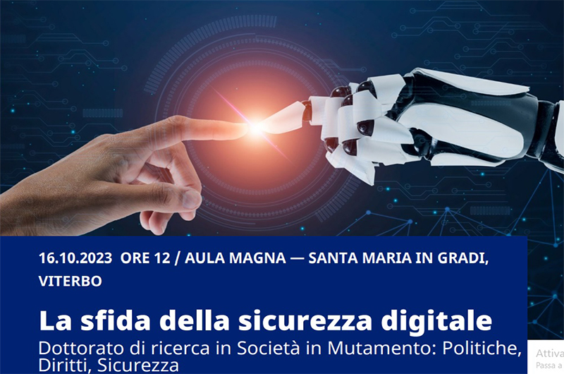 Il 16 ottobre presso l’Università degli Studi della Tuscia, nell’ambito delle attività del Dottorato di Ricerca in “Società in Mutamento: Politiche, Diritti e Sicurezza”, Sua Eccellenza il Prefetto Bruno Frattasi, Direttore Generale dell’Agenzia per la Cybersicurezza Nazionale, terrà una lectio magistralis sul tema delle minacce informatiche e della sicurezza nazionale.