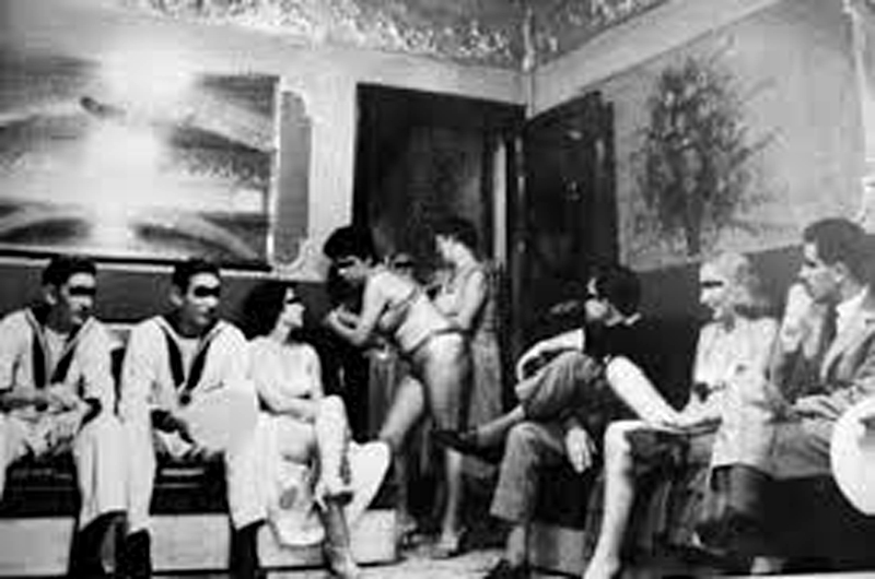 In quanto alle “signorine”, che cambiavano ogni “quindicina”, si facevano largo servette, sartine, commesse, orfane, contadine, figlie di famiglie numerose provenienti, tutte, dai ceti sociali più bassi. Sapevano essere pazienti e materne con gli sbarbatelli alla prima prova. Abbigliamento da avanspettacolo fatto di veli, reggicalze, gonne con ampi spacchi e tacchi a spillo. Ricordo che fuori della porta di accesso, sulla strada, in alcuni momenti della giornata s’adunava una folla di minorenni (per entrare occorrevano 21 anni) che sospiravano tra schiamazzi e risate il raggiungimento della maggiore età. Spesso ci pensava la polizia a diradare lo sciame con minacce di arresti.