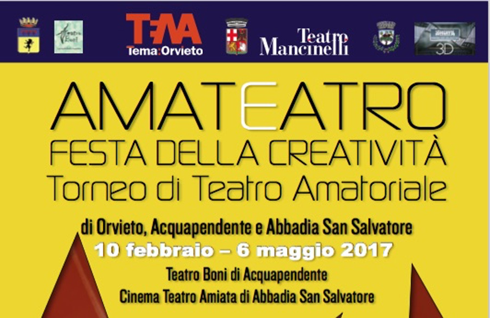 Dopo il grande successo degli scorsi anni, l’Associazione Te.Ma. di Orvieto, in collaborazione con l’Associazione Teatro Boni di Acquapendente e il Cinema Teatro Amiata di Abbadia San Salvatore, torna a proporre “Amateatro. Festa della Creatività”, il torneo di teatro amatoriale giunto alla quinta edizione. Nato a Orvieto per valorizzare la ricchezza di compagnie del territorio impegnate nel teatro amatoriale, la larga partecipazione e l’esperienza positiva di una gara che ha messo a confronto spettacoli di generi diversi ma tutti di grande qualità ha spinto l’Associazione Te.Ma. ad allargare l’area di riferimento, che dall’ultimo anno interessa i tre comuni, coinvolgendo quindi tre regioni limitrofe: Umbria, Lazio e Toscana.