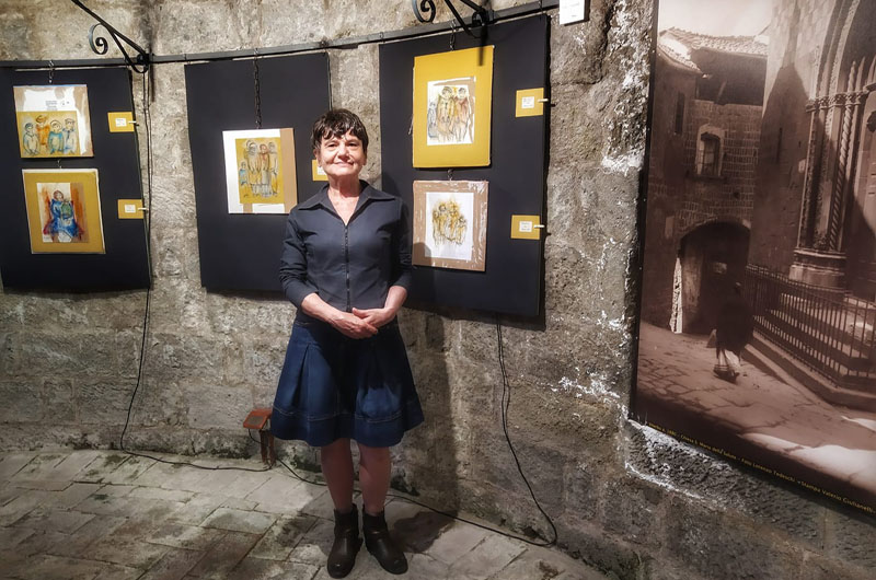 Entrando in questi giorni nell’intima e raccolta chiesa di Santa Maria della Salute, in via Ascenzi a Viterbo, si possono ammirare le opere della pittrice e scrittrice Amelia Duranti, in una suggestiva mostra dal virtuale nome di “Cartoon”. Si tratta di disegni che l’artista ha voluto realizzare su carta paglia e su cartoni da imballaggio, sfogliandoli con delicatezza fino a separarne gli strati. I tratti delicati a carboncino svelano volti e figure, colorati a olio e a cera spalmata a lametta: blu oltremare, ocra, terra di siena, verde foresta. L’anima ondulata del cartone affiora qua e là e, insieme a sapienti tagli, l’artista dona matericità e spessore al racconto visivo. Amelia Duranti, romana residente a Viterbo, ci illustra il filo conduttore delle opere esposte. «Tutta la mia avventura artistica ha l’obiettivo di accendere tanti fari sulle fasce più deboli dell’umanità: i poveri, gli ultimi, i protagonisti involontari della marginalità esistenziale, che è trasversale. E soprattutto, di accendere un riflettore sui bambini, spesso esposti ai peggiori abusi. Il mio messaggio, diretto alla politica e alla gente comune, è quello di darsi da fare per cambiare la situazione». Clochards, famiglie disgregate, bambini dimenticati… Ogni disegno è un racconto, mai rabbioso eppure diretto e convincente. Dal suo punto di osservazione, l’artista romana si fa attenta interprete dei comportamenti umani, soprattutto nei contesti più difficili. Un anno e mezzo fa, Amelia Duranti ha esposto le sue opere nella chiesa del Gonfalone: quest’anno ha ottenuto quella di Santa Maria della Salute, di grande atmosfera – e come il Gonfalone, solitamente chiusa al pubblico. Questa bellissima chiesa viterbese, nota per il magnifico portale, venne edificata nel XIII secolo da Fardo di Ugolino di Uffreduccio, grande filantropo e benefattore. «Mi ritrovo in compagnia di Mastro Fardo, che è sepolto qui davanti all’altare», aggiunge Duranti, mostrandoci la lastra in peperino. «Ci siamo ritrovati, accomunati dal fatto che a nostro modo e ognuno nella sua epoca, ci siamo prodigati per la marginalità». Amelia Duranti si è sempre sganciata volutamente dalle convenzioni e dai circuiti delle mostre ufficiali, tuttavia le sue opere sono note ed esposte in luoghi più che prestigiosi. «Per fare questo mio “percorso” e veicolare meglio il mio messaggio al mondo, ho scelto di far comparire le mie opere sine die in siti difficilissimi da conquistare: il Chiostro del Bramante, al Pantheon, Santa Maria in Cosmedin, il Sacro Convento di Assisi». Opere di Duranti sono collocate inoltre in modo permanente anche in cornici straordinarie come il Sacrario delle Fosse Ardeatine, Santa Maria del Popolo, la Corte Costituzionale. La mostra è aperta fino a domenica 27 settembre, dalle 14.00 alle 19.00. Le opere esposte sono acquistabili.
