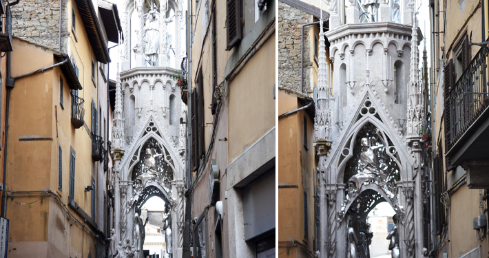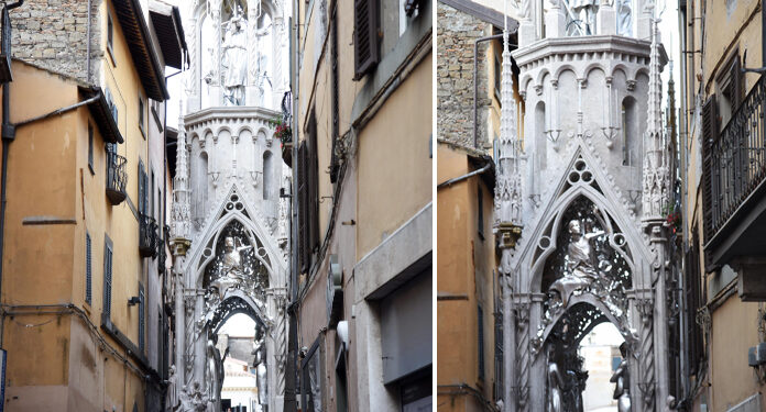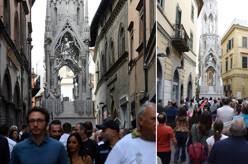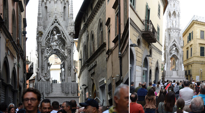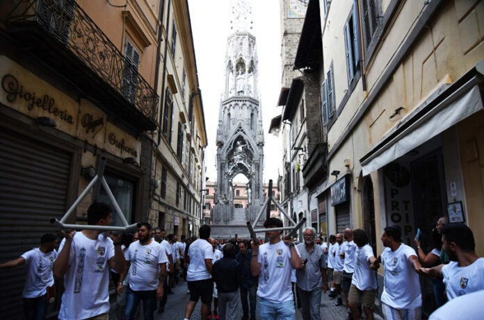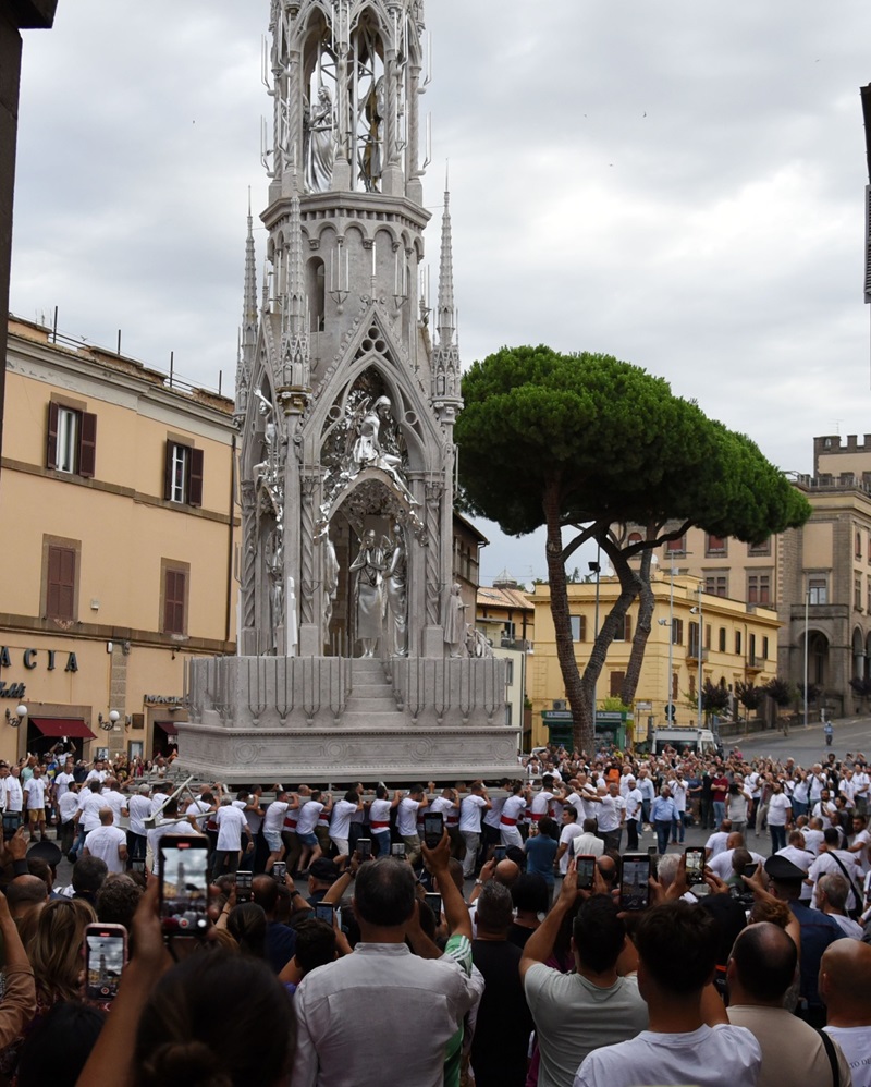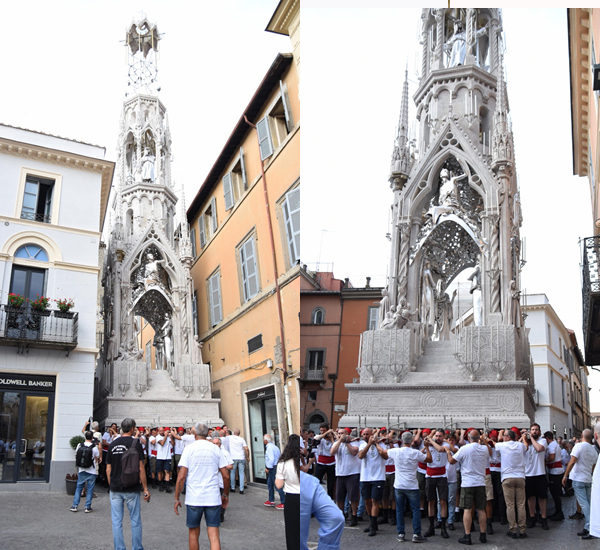 Si vede già la bellezza di Dies Natalis, pur nell’opera incompleta di pezzi e di effetti speciali, come le luci. Qualcuno in strada stamani vociferava: “Questa Macchina sarà pure bella da ferma perché spinge a essere osservata nel suo significato”. Pensiamo a quei toni di grigio argento nei quali si identificano le gamme cromatiche di una Viterbo medioevale, il modo migliore per carpire la vera essenza del luogo, il resto lasciamolo al 3 settembre. C’è ancora tanto da scoprire. L’ultima parola va spesa per i Facchini, sempre composti nella loro prova di forza e di amore. Visti tanti volti giovani, segno di una continuità che porta dentro il valore di un sentimento inseparabile per la propria città e per la propria Santa. (S.G.)