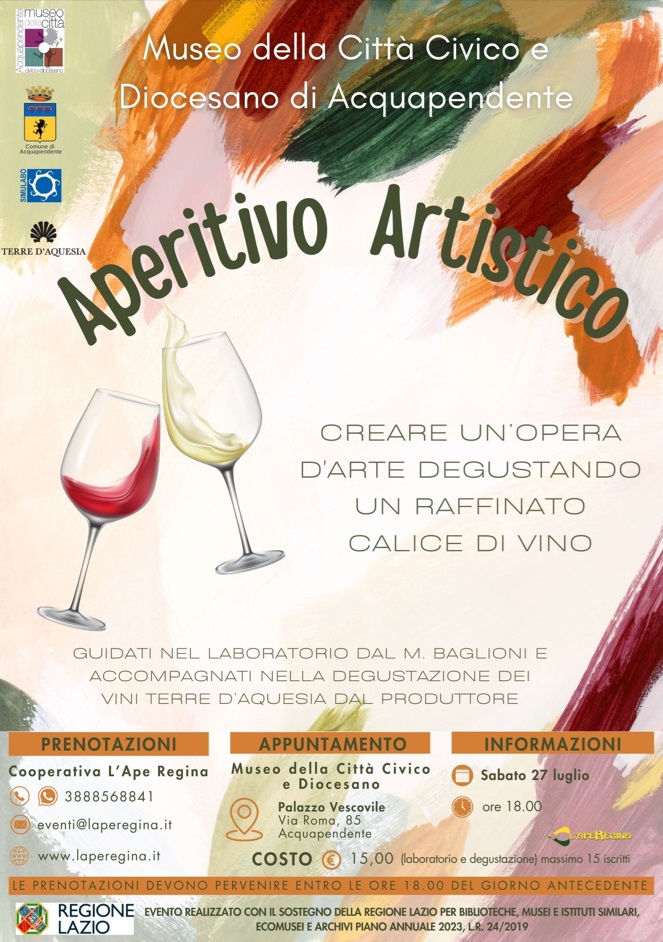 L’Aperitivo Artistico è un evento realizzato con il sostegno della Regione Lazio per Biblioteche, Musei e Istituti Similari, Ecomusei e Archivi Piano Annuale 2023, L.R. 24/2019. Non perdete l’opportunità di vivere un’esperienza indimenticabile all’insegna dell’arte e del buon vino.